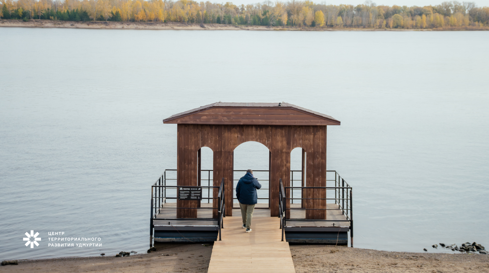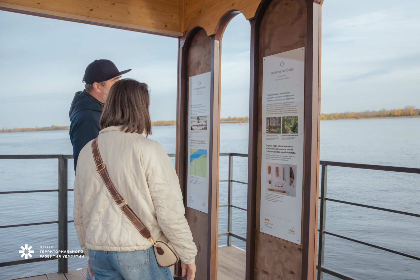 Уже несколько месяцев в «Сарапульских островах» работает новое пространство под открытым небом, где об истории купеческого города можно узнать стоя на воде. Это небольшой филиал Сарапульского музея-заповедника — «Остров истории», установленный на понтоне.