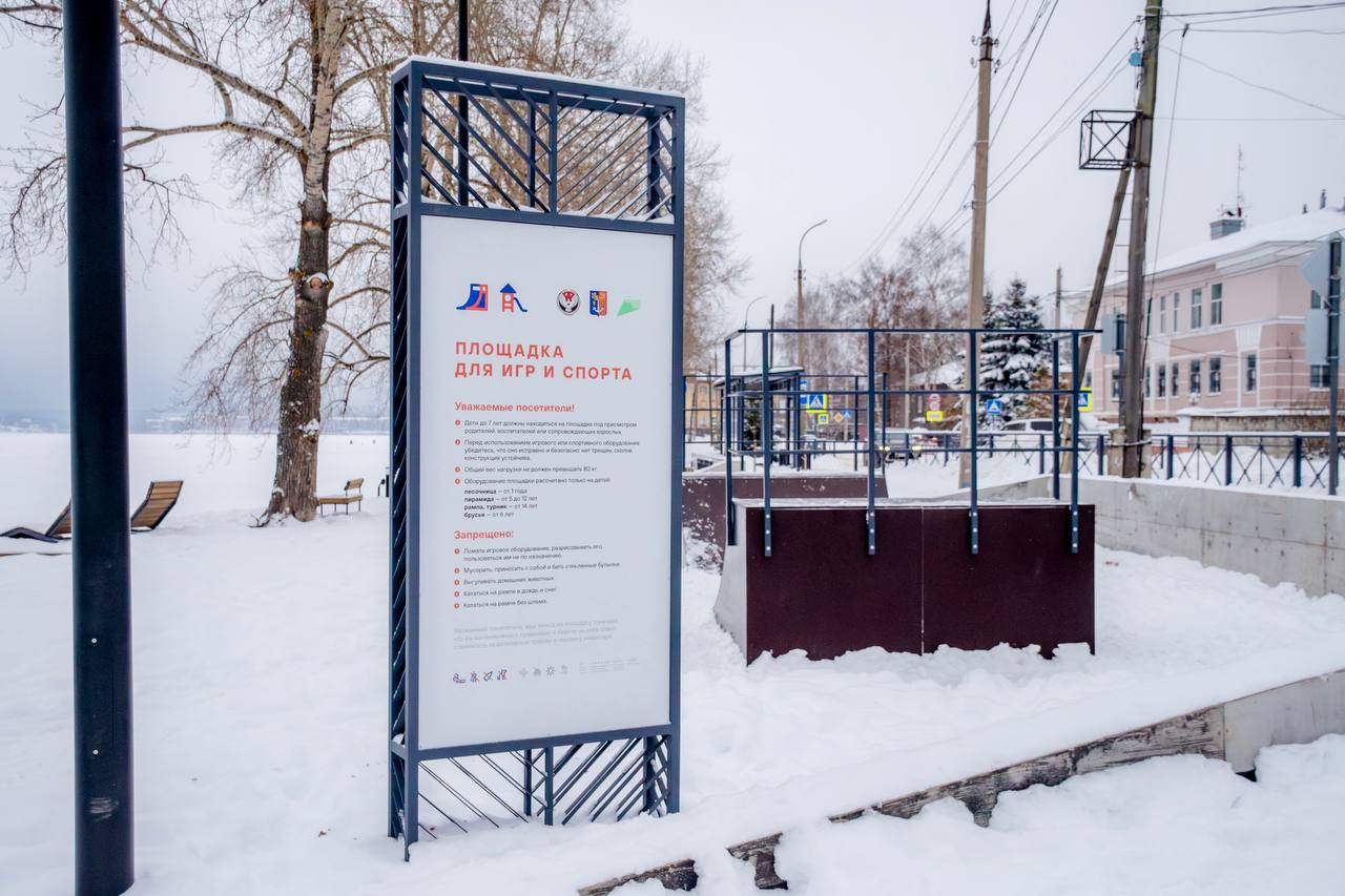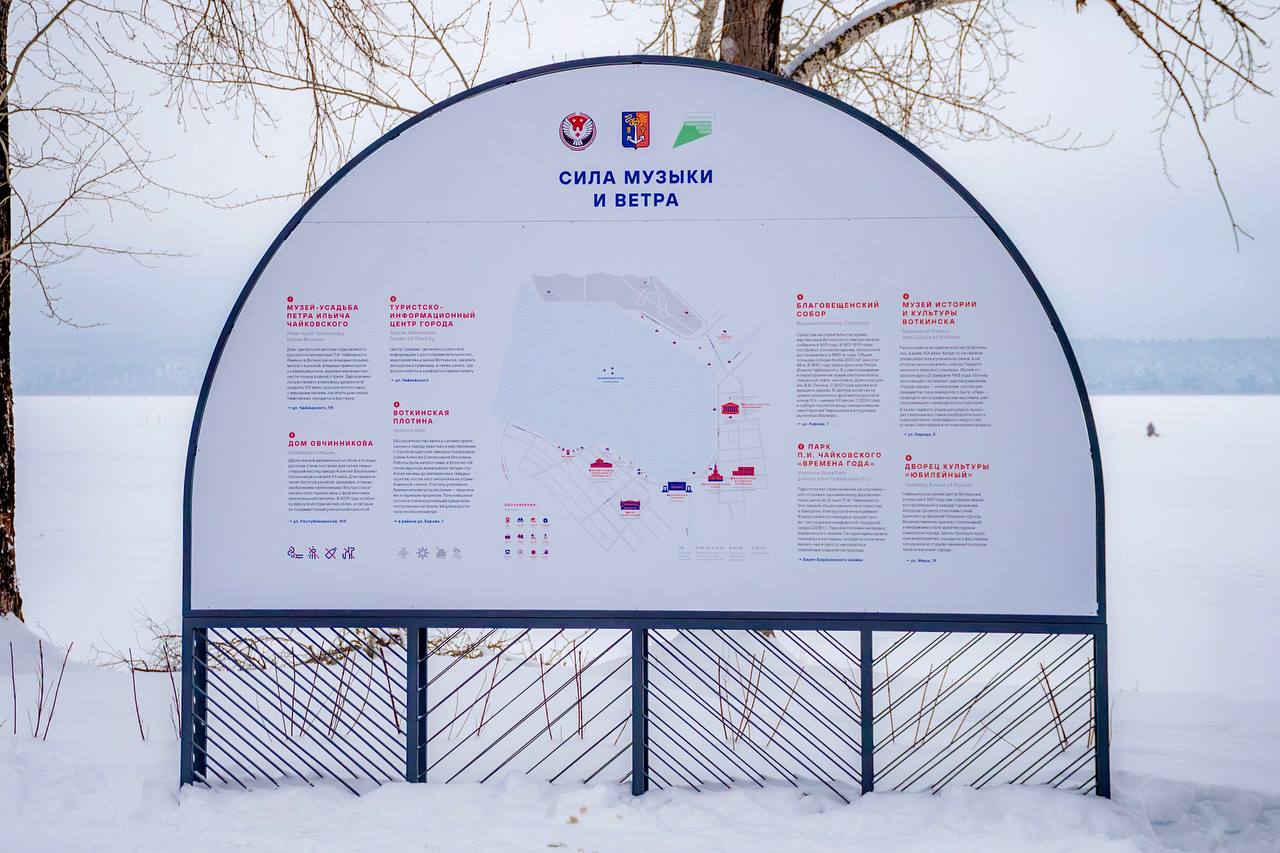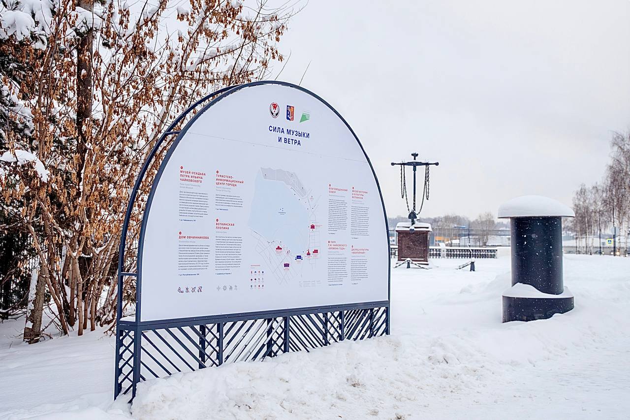 В конце года на территории также появились информационные стенды. Для уже готовых конструкций, предусмотренных проектом, дизайнеры Центра территориального развития Удмуртии разработали туристическую карту с достопримечательностями Воткинска, а также макеты для функциональных зон.