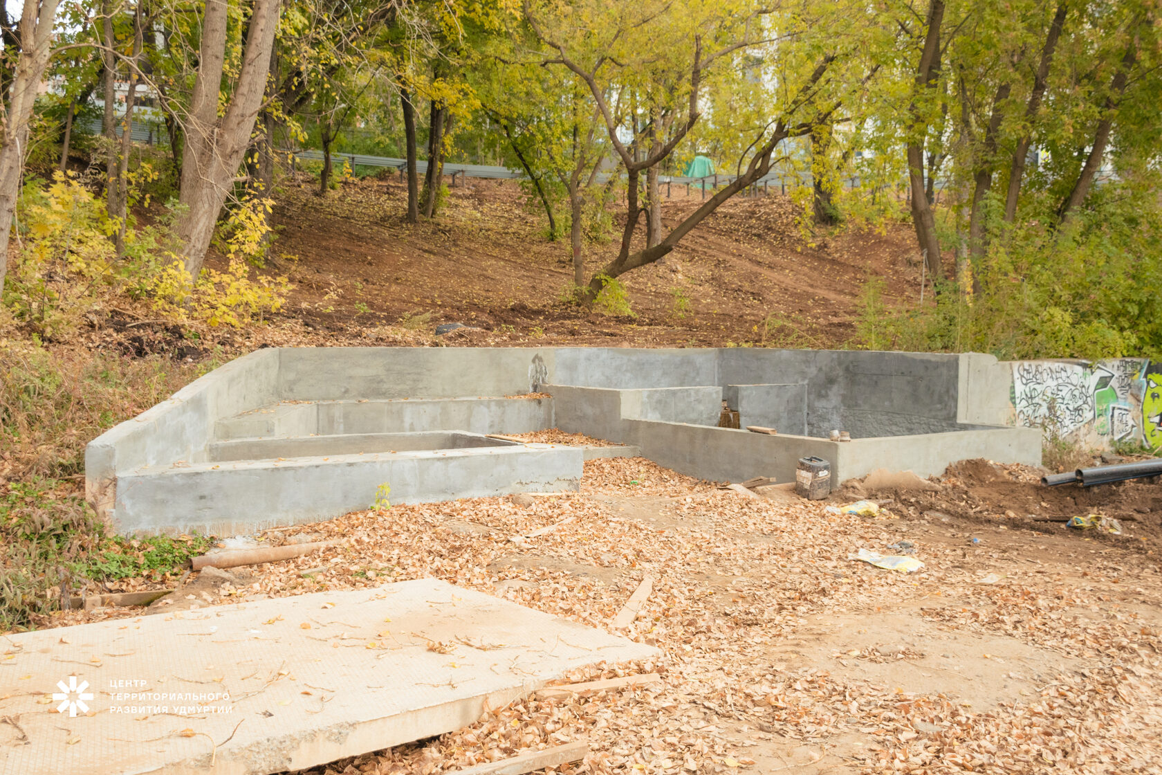 Благоустраиваются родники, формируются дорожки от монумента и тропиночная сеть к Дворцу детского и юношеского творчества — основания под деревянный настил почти готовы. Ближе к воде продолжается прокладка инженерных сетей.